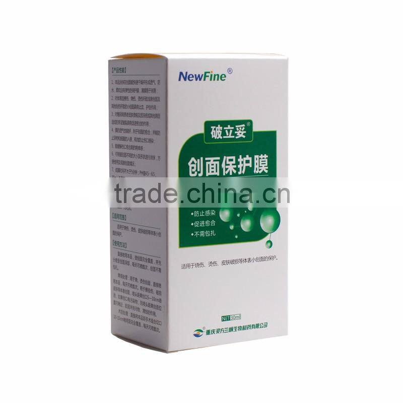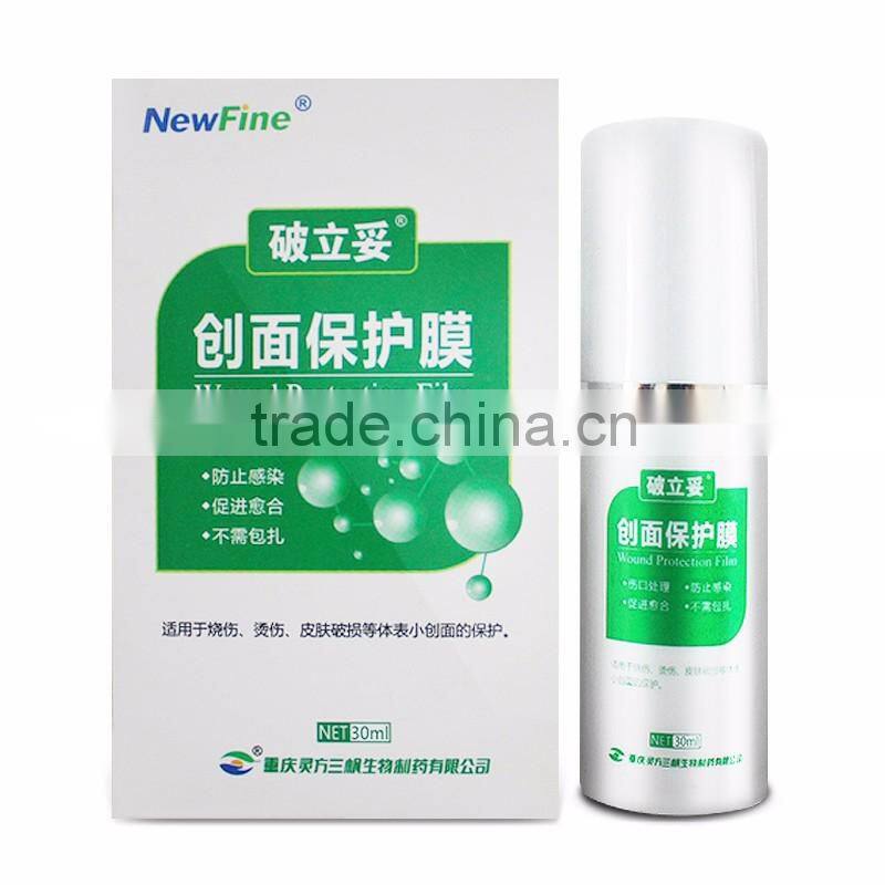 1. Smeared on the wound surface, this product dries quickly to form a protective film. The film is air permeable, waterproof, soft and elastic, and is easy to peel off.2. This product can stop the bleeding and protect the superficial wounds caused by chafing, burning, scalding, and small wounds caused by other injuries.