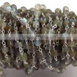 3 Feet Natural Blue Fire Labradorite Heishi Shape Smooth Rosary Style Wire Wrapped Beaded Chain 925 Silver Plated