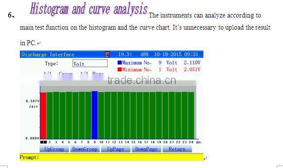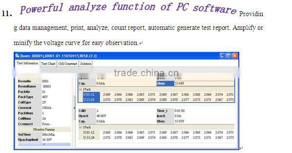 Perform discharge of constant current taking advantage of intellectualized dummy load after the battery pack is removed from system, set up the parameters of “discharge current”,“discharge time ”,“discharge capacity” ,“final protective voltage of whole pack” and“ final protective voltage of cell”, and the tester could carry out discharge function automatically, display discharge current,battery discharged capacity,the whole pack voltage, cell voltage, discharge time and etc at real time;