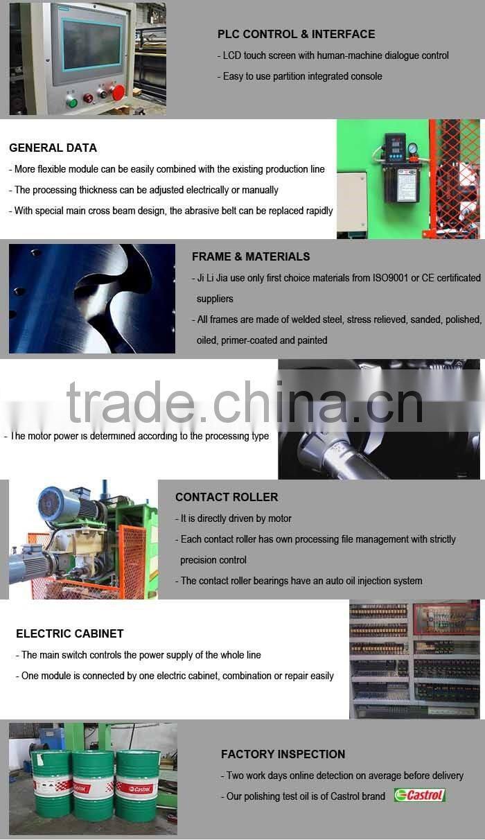 JMSB series with brushing roller rapid replacement, online repair, speed adjustable control function, which is possible to obtain the surfaces with soft, bright and homogeneous appearance that are suitable for interior design, household appliance, food industry and and all the fields that require a high level of cleanness.