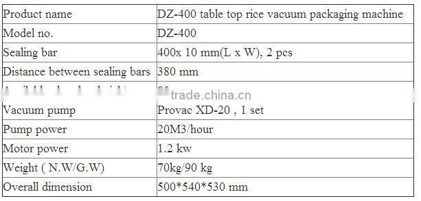 - Main specification of DZ-400 table top rice vacuum packaging machine: