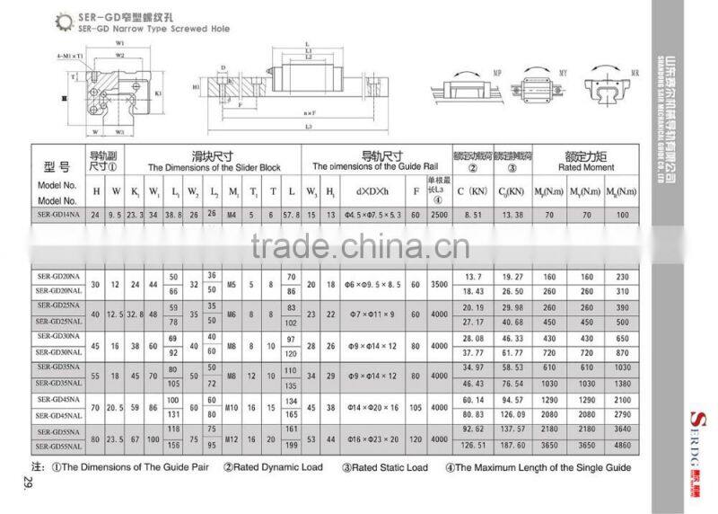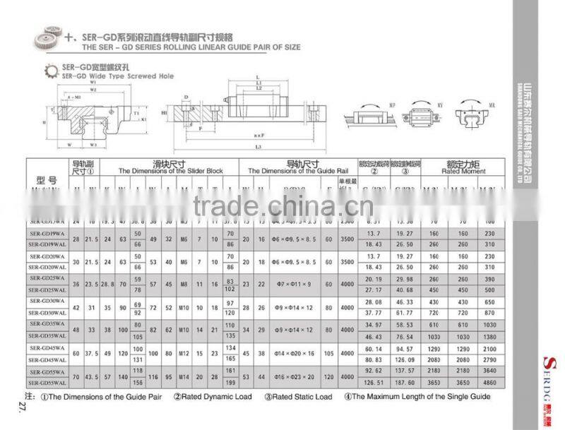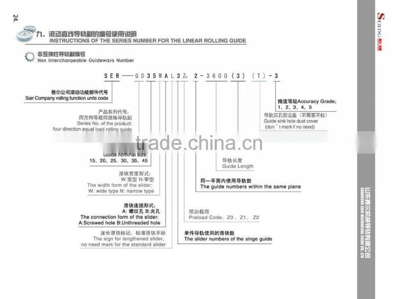Linear rolling guide rail is precise linear guide part.With high precision,large load,good rigidity and smooth operation as its good characteristics,it has been widely used in CNC machinery,automation line as well as other fields. SER-GD series linear rolling guide rail,is one of the main products belonging to Sair who is a professional manufacturer in producing rolling functional components.