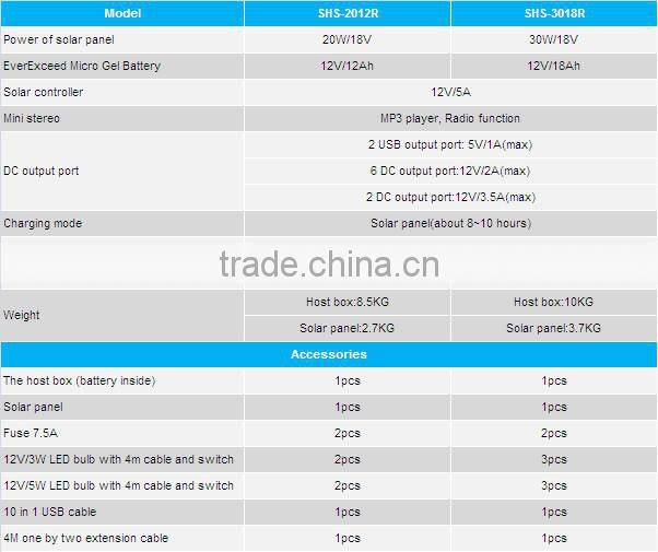 With 6 DC output port and 2 USB port, Solar Home System (SHS-2012R,SHS-3018R) is designed for a variety of household application, such as lamp, TV, fan, mobile phone. The built-in EverExceed Micro Gel battery with +2200 deep cycles allows it to work perfect for your application. Also it provides build-in Mp3 and radio function which is more convenient and entertainment. Solar Home System has been proved to be outstanding for its features like portable volume, stable performance, nice looking, multifunctional, tailor solution available, etc.