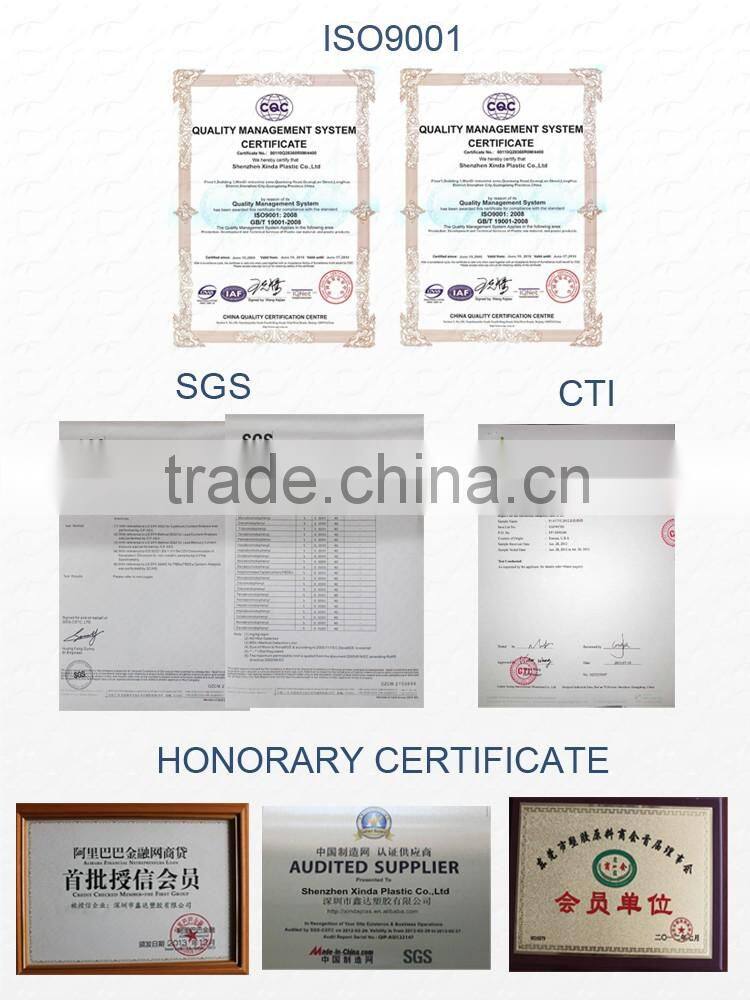 XINDA Plastic has passed ISO9001:2008 Certificate.and our products passed SGS,CTI,FDA certificate.in the past years,our company has get many honorary certificate.such as the gold supplier on alibaba,credit supplier on alibaba.The member of China Plastics  Industry Association.Audit supplier in made in China Etc.