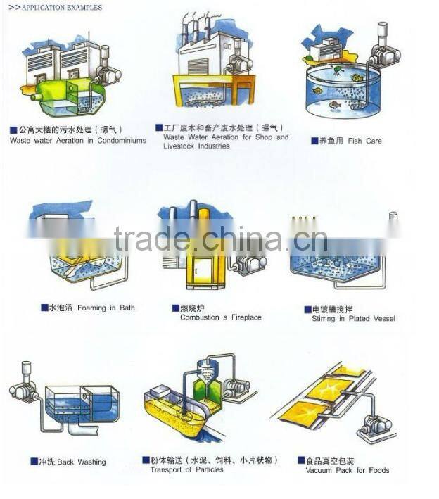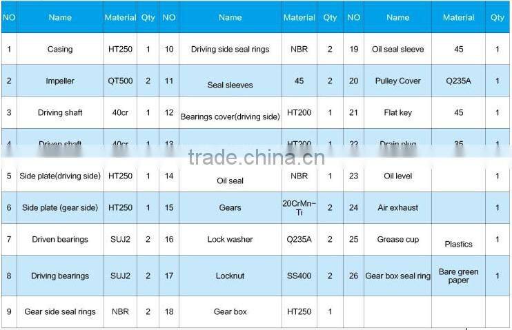 Roots blower consists of Casting. Impeller, Drive Shaft, Beraing and all 25 ccomponents. Its advantages including low nosie, energy saving. Long lifetime, Stable air flow and so on, it was widely appliede for many fields like Aquaculture, wastewater treatment, air/gas/grain/biogas stc transporting.