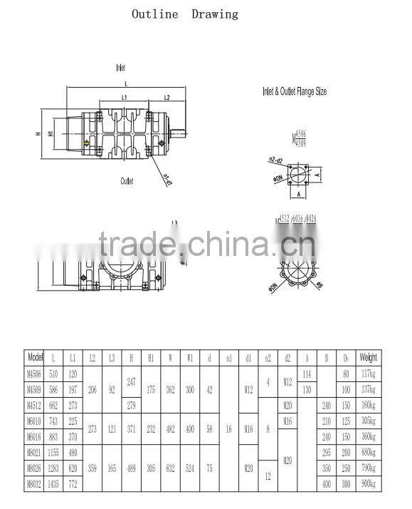 Series M Roots Blower (also called Positive Displacement Blower - PD Blower, or Rotary Blower) with tri-lobe are heavy duty style new products which technology is from America. It is the replacement for Duroflow models of Gardner Denver, RAM/RCS models of Dresser Roots, and RBS models of Robuchi.