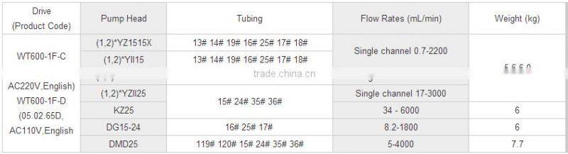 Applicable peristaltic pump heads for WT600-1F are YZ1515X, YZ2515X, YZII15, YZII25, KZ25, DMD25 and DG15-24 . The pump delivers flow rates from 0.7-6000 mL/min and dispensing volumn is from 0.1 mL to 99.9 L. Combining 128*32 LCD display with membrane keypad and rotary encoded switch makes the operation easy and prompt. The speed can be adjusted manually or automatically through external control interface.