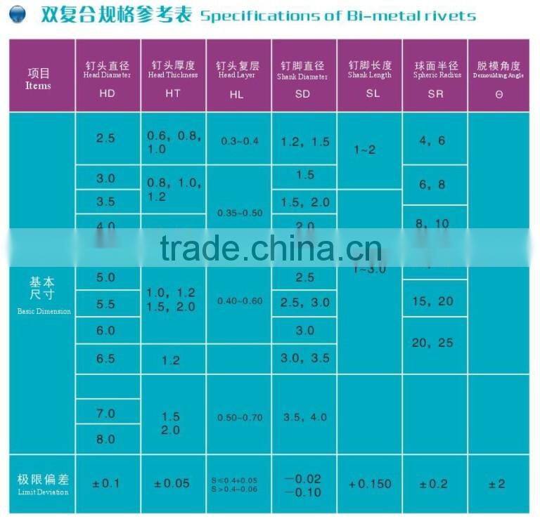 bimetal rivets:the material of composite rivet's working layer is more flexible to choose than the solid precious metal rivet's,it doesn't need other processing technique.