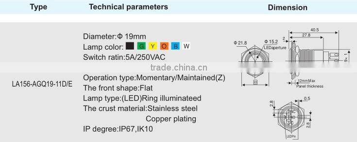 Home > Products > Push button switch > 1NO1NC/2NO2NC (LED)Ring Illuminated 19m Tact Switch