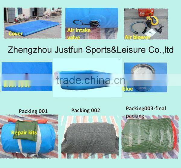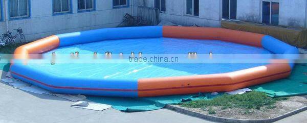 Inflatable pool made of 0.9mm PVC tarpaulin by the technique of heat welding/air sealed, we can put kid bumper boat, handle boat, inflatable water ball, water roller,water trampoline,and water totter in the inflatable swimming pool for children playing.
