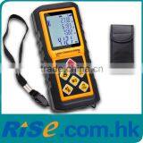 The LCD has Backlight and you can aim the object with Laser Pointer. This advanced instrument has "Temperature Compensation" for greater accuracy because temperature will affect speed of sound. It is also featured with measuring sensitivity adjustment for different measuring purposes, switchable between metre (m) or feet (ft), Temperature measurement (ºC or ºF), 5 groups of memory storage and Calculation of Area and Volume.