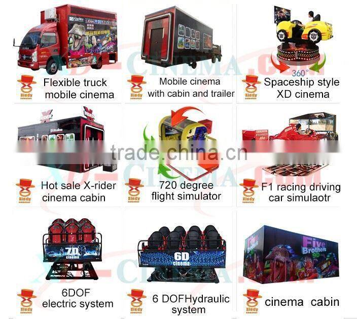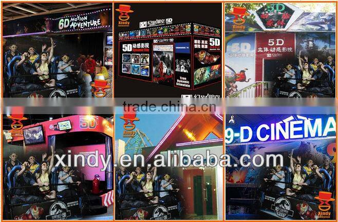Guangzhou Xindy Animation technology co., LTD designs and manufactures the full set 5D cinema equipment with the outside cabin.Based on more than 14 years of Industry technology experience, a number of specialized technical skills and a contingent of skilled staff team, we devotes ourselves to the research and development, manufacturing and sales of 3D cinema system, 4D Cinema Seats, 5D cinema equipment, mini 7D cinema,9D cinema, 12D cinema, XD cinema, Dynamic Simulant Platforms, motion chairs, 2015 latest technology new products for 5D 7D 9D cinema and full set of 5D /6D/7D/9D/10D/11D /XD cinema Systems.