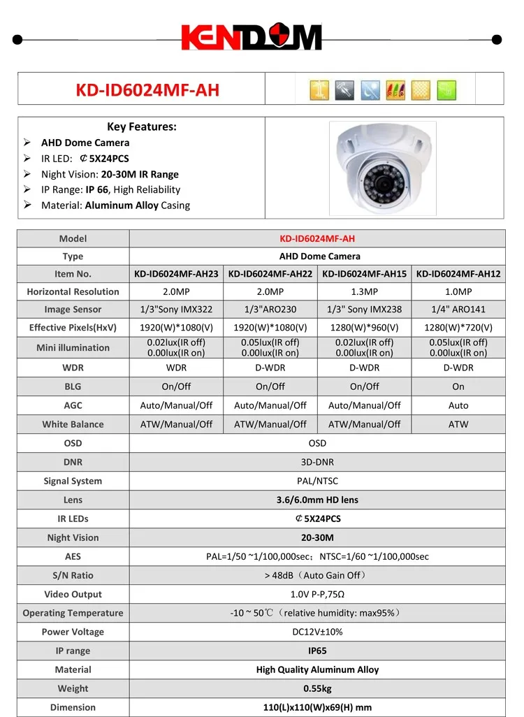 Kendom 2Megapixel HD AHD Vari-focal LensCCTV Camera With Weather Proof IP 66 Passed ROHS CE FCC Certificates