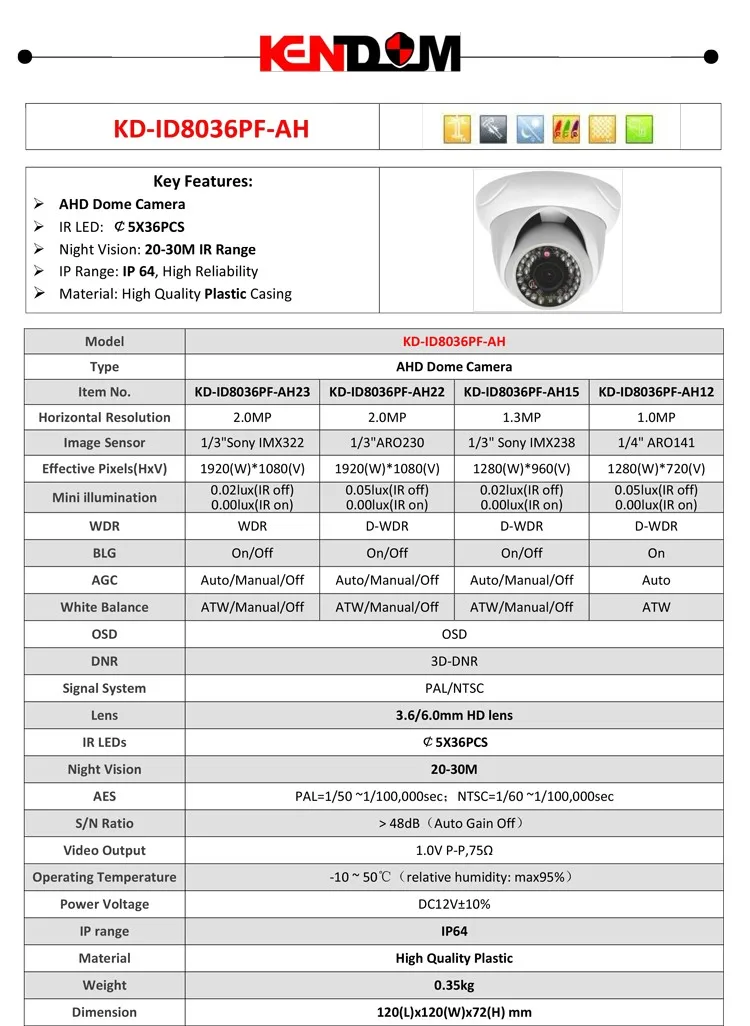 Home > Products > AHD Camera > Kendom Manufacturer China Cctv Surveillance System Capture Cost Effictive ir Ahd Dome Camera With 36pcs ir Leds