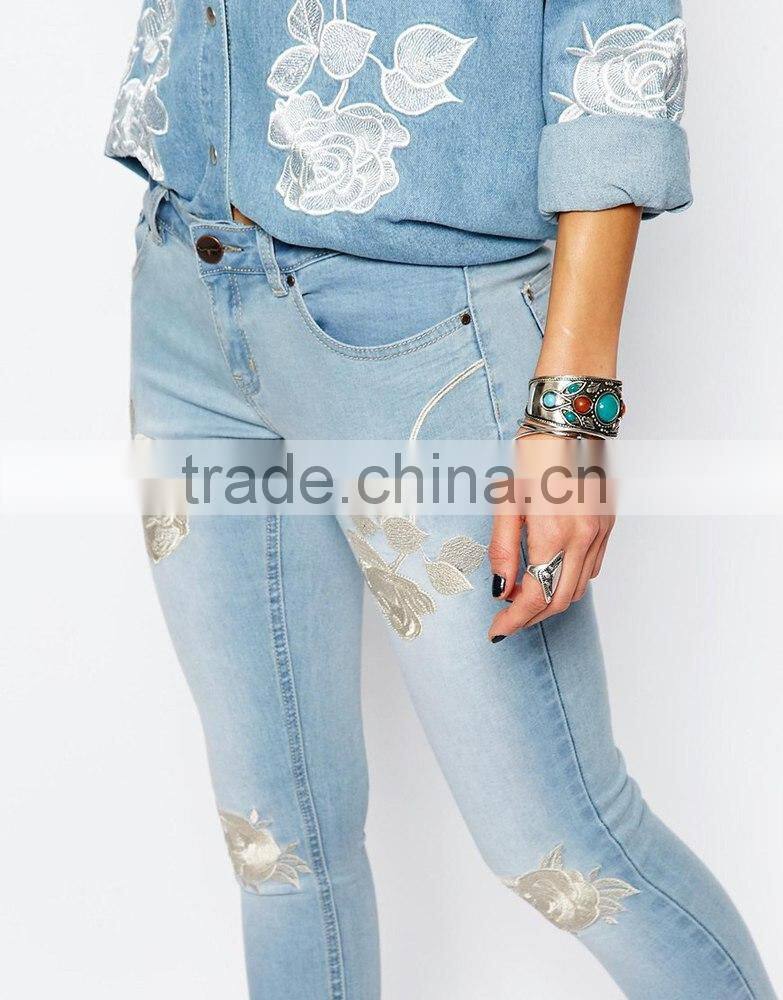 2016 New Arrival Branded Hot Sale Cotton Women Jeans With Floral Embroidery
