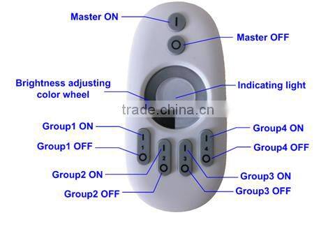 3,Group operate instruction: if there is A and B two piece controller receiver, first to Power the receiver A, then press the “Group 1 ON” button for five times then the led will be flash, this means receiver A is controlled by Group 1. Second to power the receiver B,press the “Group 2 ON” button for five times, than the led will be flash, this means the Receiver B is controlled by Group 2. When press the “Master ON” button, Receiver A and B are turn on at the same time, press the “Master OFF” button, Receiver A and B are turn off at the same time , A and B receiver are changing the same when press the touch color wheel . IF you want to controller receiver A/B separately, please press the “Group 1 ON” button first, than you can adjust Receiver A brightness or turn ON/OFF receiver A . Meanwhile, Group 2/3/4 are the same.