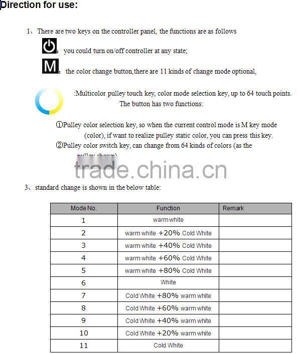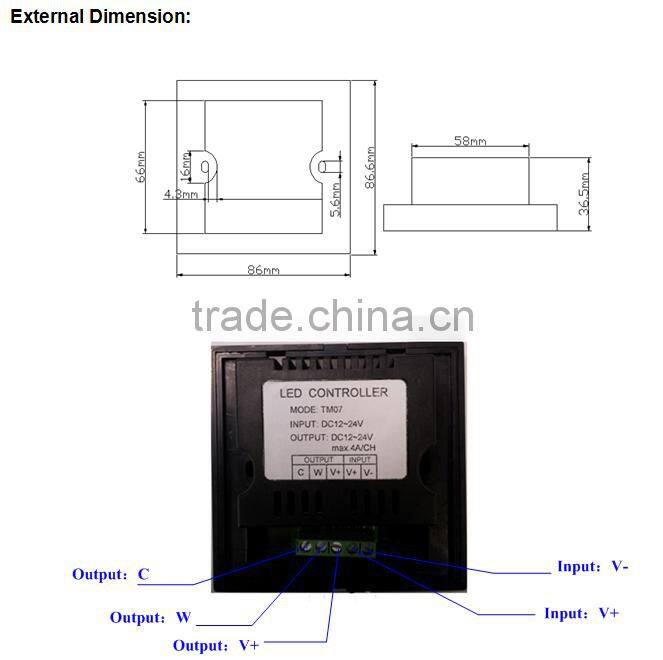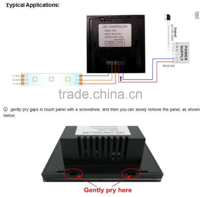 This Touch panel Color-temperature controller is a new high-end controller newly designed by our factory.The glass panel design, makes the appearance more beautiful and fashionable. It adopts high precision capacitance touch control chip, increases the touch sensitivity,and can reduces trigger which caused by mistake.It is used for controlling a variety of lamp whose source of light is LED.For instance,point source of light,flexible light strip,wall washer lamp,glass curtain wall light etc., it has many advantages such as convenient to connect, easy to use ,etc.It can realize cold,white warm white,pure white light Color-temperature and other effects of lighting change.