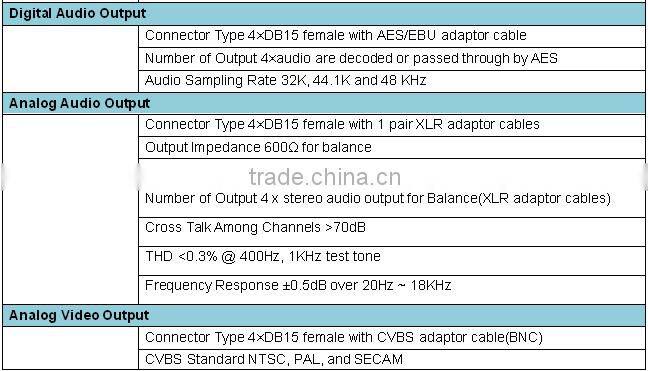 market to de-crypt multiple pay TV services. IRD1341 is also a professional IRD that features a broadcast quality decoder of MPEG-2 and MPEG-4 AVC/H.264 in both Standard Definition and High Definition formats, and provides a variety of industry standard digital and analog outputs, including 4xHDMI, 4XCVBS video, 4XAES/ EBU Audio, and 4xBalance Audio. The unit also performs HD down-conversion and aspect ratio adaptation of HD programs to generate professional quality baseband analog video and audio outputs for easy integration with existing cable network infrastructure. IRD1341 provides operators an ideal solution for multi receiving,