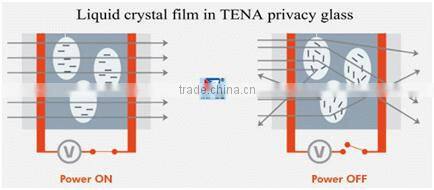 Description & scientific principle | TENA switchable glass is composed of layers of glass sheets & interlayer films, with an electric switcher and a remote cotrol. The core film (PDLC-Polymer Dispersed Liquid Crystal) has the property of “switchable color-changing”, that is, when the power is on, the glass is transparent; but when the power off, it turns to be opaque immediately. (As shown below by the photos).