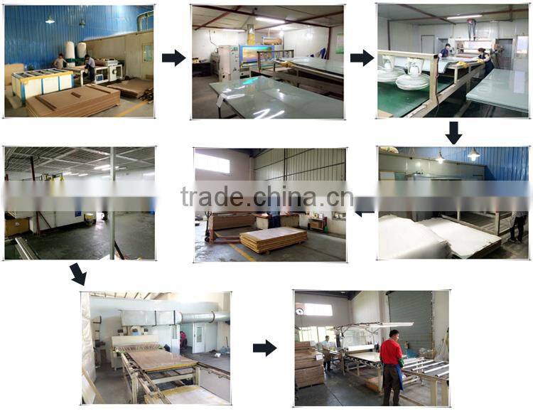 ♦ Clean up ♦ Roll on glue ♦ Laminating film leather ♦ Pressing paste Use the advanced double roll press for pressure to make the cover material and panel more tight and smooth. ♦ Sanding Use the advanced piano abrasive belt sander to sanding the surface of the panel, the panel can be evenly sanding to increase the effect of adhesion, and clean up the panel again after completion of the sanding. ♦ Painted surfaces Choose the best quality coating material to painting the surface of the panel, in order to achieve the secular effects on the surface of the panel and scratch resistance. ♦ Curing coating material Using advanced curing equipment, curing coating materials, make the coating material with panel as a whole. ♦ Covering the protective film Covering a layer of transparent protective film on the finished panel, in order to protect the panel during packing and shipping, etc.  |