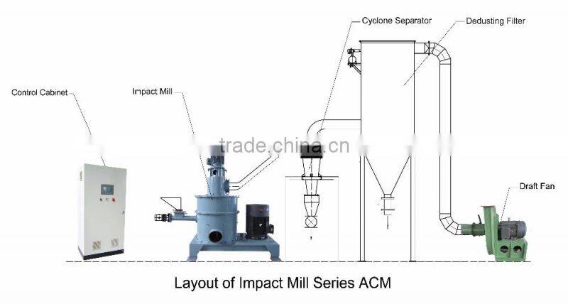 Ultra-fine Impact Mill ACM series is a reflective-type vertical mill. Classifying equipment is set in comminution chamber. Airflow transfers comminuted material to classifier for collection. Classifying equipment replacing traditional screen, functions both comminution and classification process, resulting high efficiency.