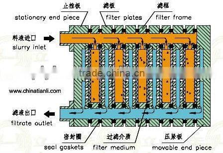 3. The plate and frame type has filter plates frames as a filter unit. Filter cloth can be easily fixed. It can find its application in products that need filter medium (filter paper, filter membrane and settling plate).