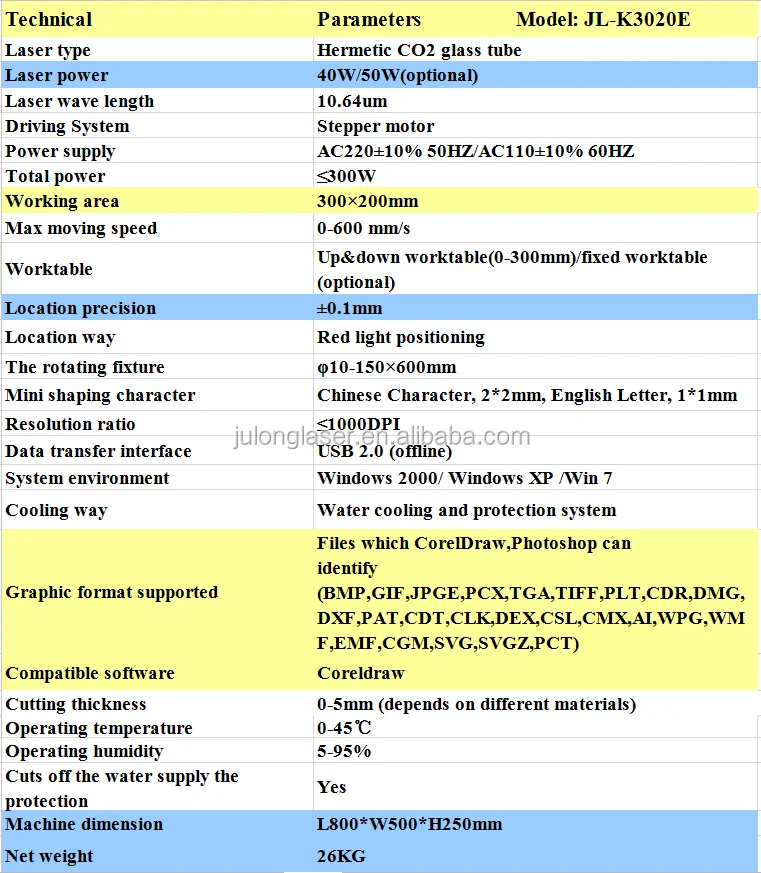 | Applicable Material | Acrylic, Crytal, Glass, Leather, Paper, plastic, Plexiglax, Plywood, Rubber, Stone, Wood | Graphic Format Supported | AI, BMP, DST, DWG, DXF, DXP, LAS, PLT | |