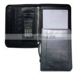 Show your clients how much your business values them, with this uniquely designed A4 size zippered compendium/conference folder/portfolio made from black leather look material. It comes complete with an internal gusseted pocket, internal zippered pocket, 25-page A4 lined pad, solar powered calculator, business card holder and pen loop.