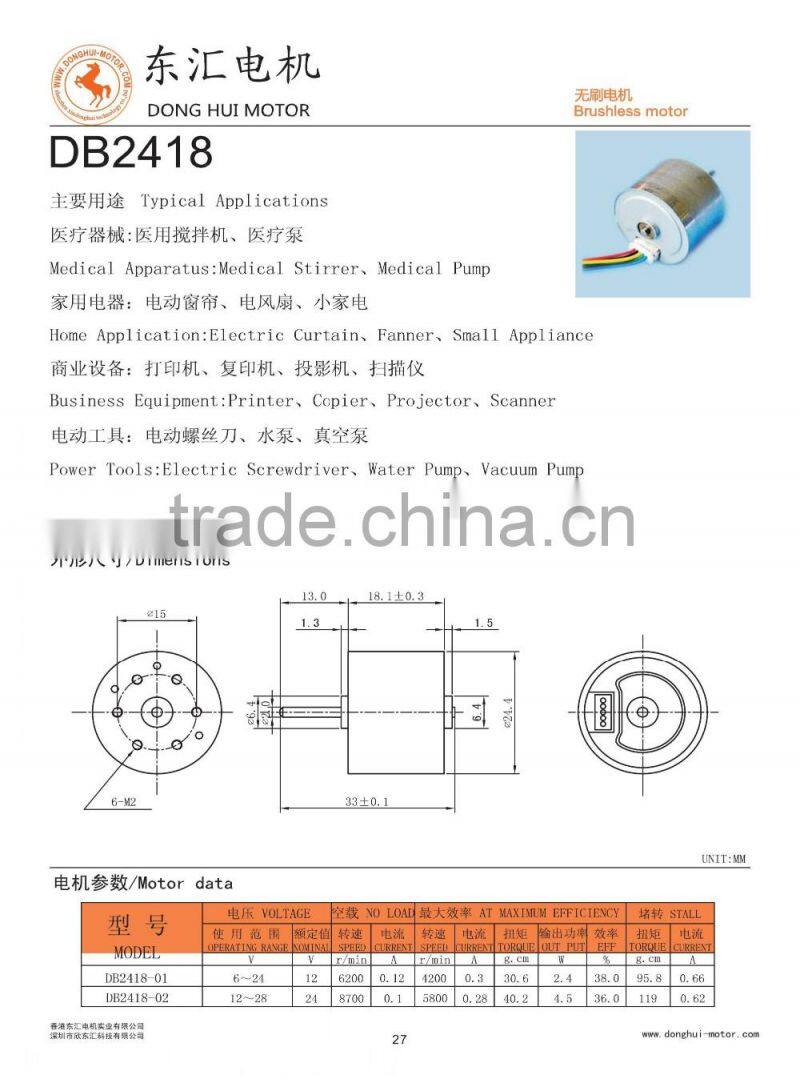 | Model Number | DBL2418 micro brushless motors with hall sensor for Medical Driver | Usage | Boat, Car, Electric Bicycle, Fan | |