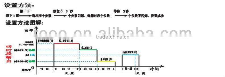 (2)2 time 0% -90% power adjustment period:(digital tube 20-29) Represents the second time working time 0 hours to nine hours arbitrary regulation,(digital tube 50-59) Represents the second time power than a 0%-90% can be arbitrary adjustable light.20 representatives it have no second time.