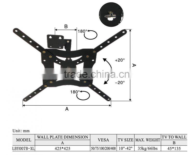 | Tilted angle | up&down -20°/+20° left&right 180° | TV to Wall | 8mm |