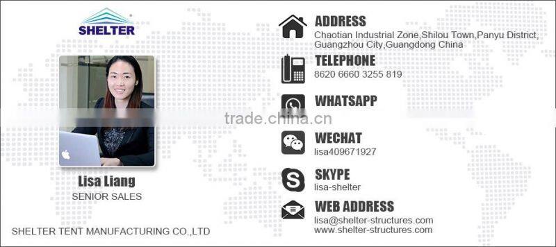 Started in 2003, Shelter Tent Manufacturing Co.Ltd. located in Guangzhou Panyu District Chaotian Industrial Zone,the facility has over 12000 sqm with the most advanced manufacturing equipment.Till now we has developed into a highly specialised manufacturer of large clear-span structures and semi permanant structures. We are so proud of our achievement in this industry and we are presently capable of producing clear-span structures of up to 50m width for event,industry,commecial and humanitaran use.Our structures are built using the world leading highest quality structural grade aluminium alloy and the covers are made from high quality PVC coated fabrics. STM also maintains a rental division with 70,000 meter square of rental stock at its disposal. Undoubtedly STM now has the largest tent rental division in China.We have since supplied our products to large International Events and Industrial Application. 1.B M W China new model public announcement 2002-2010 2.IFAI World Cup 2007 3.BEIJING Olympic Game 2008 4.Formula 1 Shanghai 2008 5.Formula 1 Singapore 2009 6.China Export & Import Fair("Canton Fair") 2009-2010 7.World Exposition Shanghai 2010