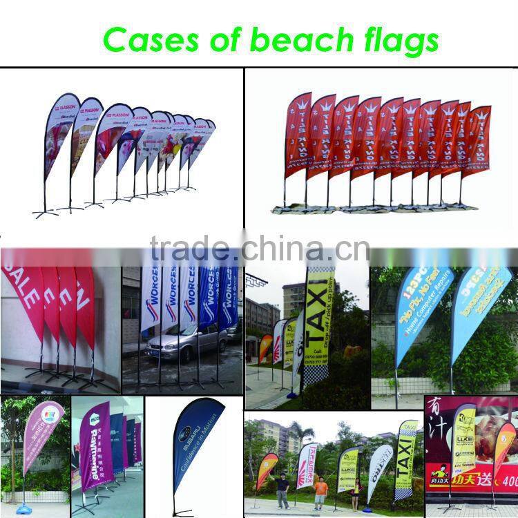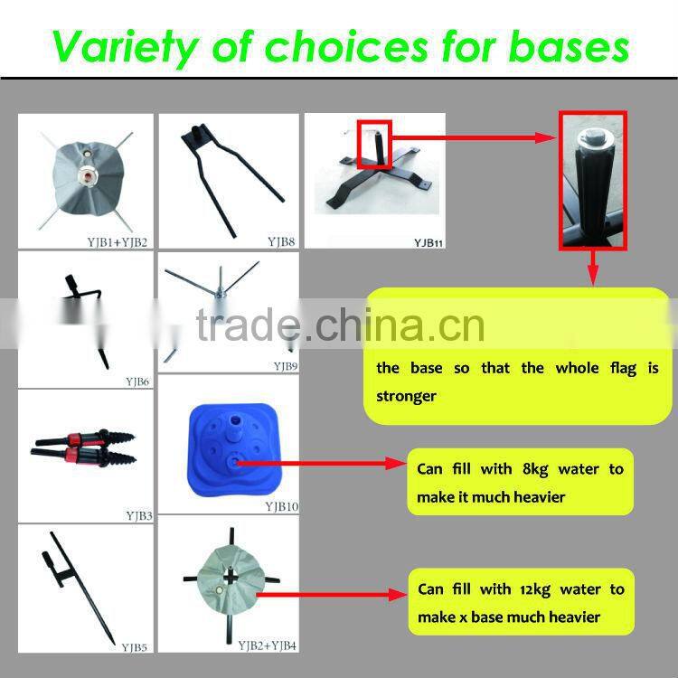 1) Material: Aluminum & fiberglass pole, iron x base with nylong water bag, polyester flag with dye-sublimation printing