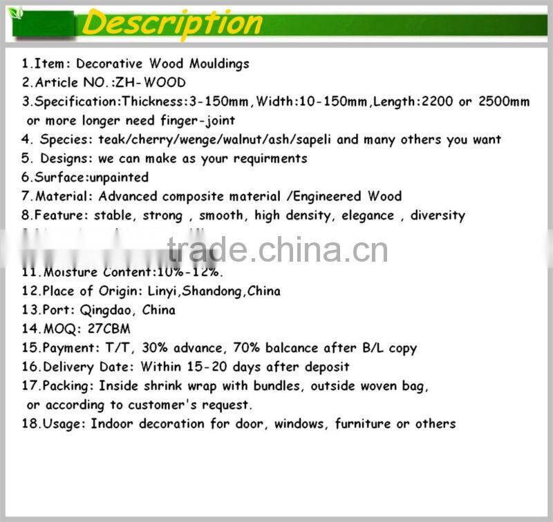 Established in 2011, Linyi United International Trading Co., Ltd specializes in the business of wood mouldings, wood veneer, stair handrail and baluster, door skin and other wooden products for more than 10 years. Located in Linyi, Shandong, China. The wood colors,grains and designs can be produced as per customers' demands. We will do our best to meet your requirement.