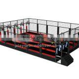 Free jump and basketball are popular events. The trampoline uses galvanized steel pipes, galvanized springs with high tensile force. The colored trampoline mat and soft padding are available. Design could be custom made. Professional technicians are available for the installation. Regular bouncing helps players excise body balance and muscles. It benefits player's health.