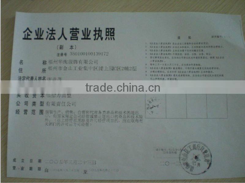 Fuzhou Huaxuan Garment Co., Ltd, is located in Fuzhou, south of China. It takes one hour from Shanghai by plan. We are the manufacturer with about 100 skillded workers, including technicians, designers, QC team, specialize in Softshell jackets, waterproof jackets, Ski jackets, fleece jackets, rainwear, workwear, reflective safty jackets.which get approval by SGS,EN471,Oekotex etc, Furthermore, the products can be tested by your detailed request.Our main markets cover Europe,Africa,North Amercia, South America.The current production capacity is around 20 thousand pieces per month.The delivery performance keeps improving also, our on time delivery rate is 40-60 days. During production,the quality control team will supervise the whole production to ensure the quality. We not only offer customer made service but also design the styles according to customers' target price. In order to offer professional service,we try best to never leave a customer waiting, never say no or tomorrow,learn how to give solutions instead of problems,how to be productive and proactive.Working professionally, sincerely and happily is always our attitude towards business. We are the family and expecting your kind attention.Thank you.
