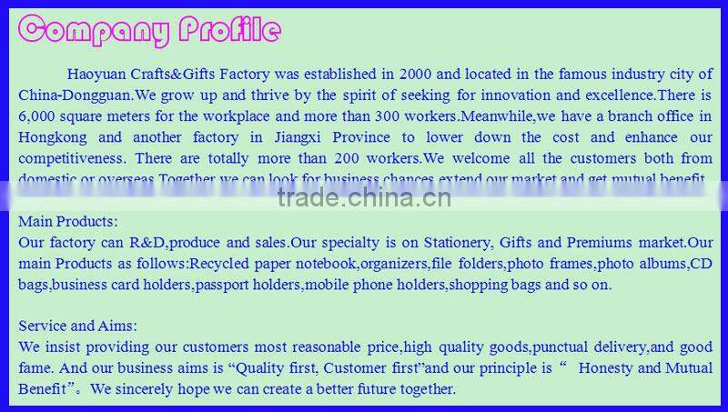 Haoyuan Industrial Company was established in 2000 and is located in the famous industrial city of China- Dongguan. We have developed and thrived with the spirit of seeking innovation and excellence. There is a 20,000 square meter workplace and more than 300 workers. Meanwhile, we have a branch office in Hong Kong and another factory in Jiangxi Province to lower down the costs and enhance our competitiveness. There are totally more than 200 workers. We welcome all the customers from both domestically and overseas. Together we can look for business chances, extend our market and get mutual benefits. Main Products: Our factory specializes in R&D, production and sales. Our specialty is stationery, gifts and premiums markets. Our main products are calculator notebooks, journal notebooks, portfolios, organizers, file folders, shopping bags, photo frames and albums, CD bags, business card holders, passport holders, mobile phone holders and related products. Service and Aims: We insist on providing our customers the most reasonable prices, high quality goods, punctual delivery, and good fame. Our business aims is "Quality first, Customer first" and our principle is" Honesty and Mutual Benefits". We sincerely hope we can create a better future together.