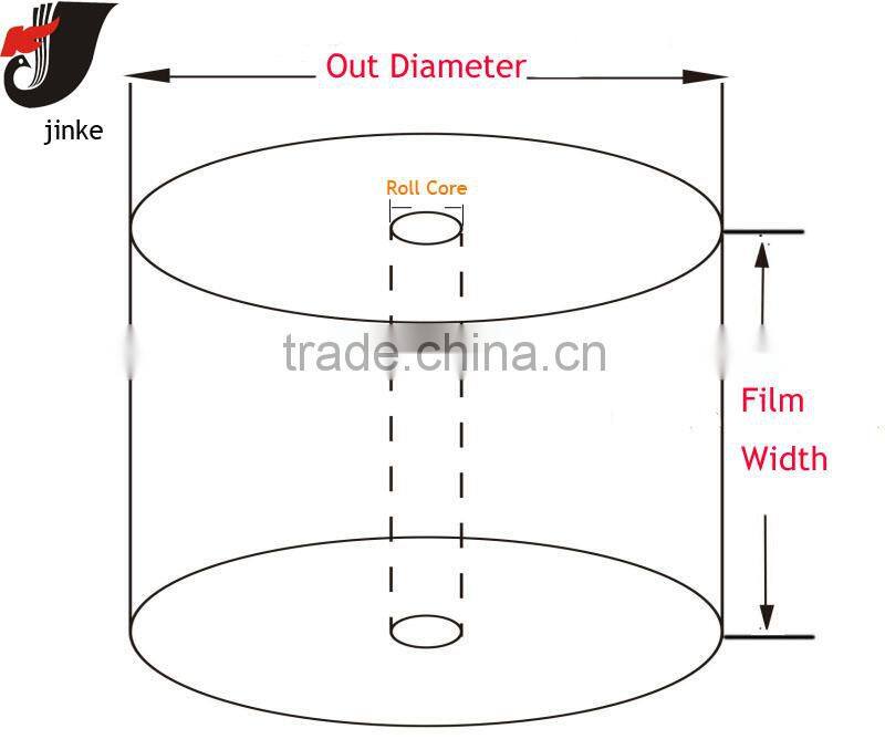 4.Size,thickness and color:Film width 15cm,out diameter 30cm,70mic single side(any sise,thickness and color are available)