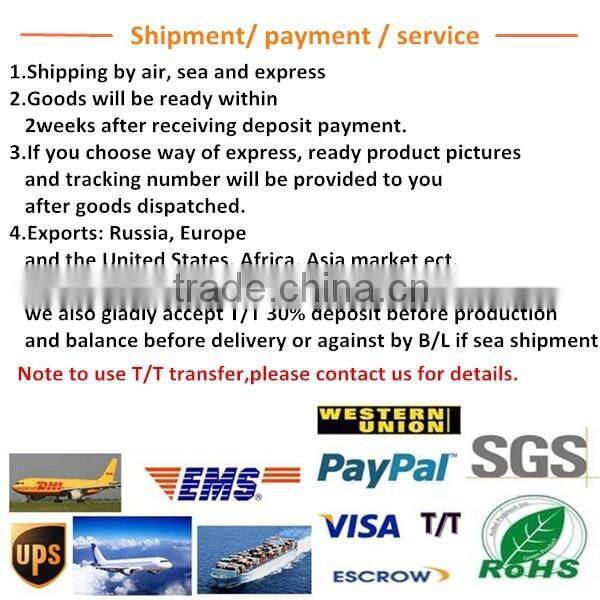 Payment terms  | 40%deposit and 60% T/T before shipment, Western Union or MoneyGram  |