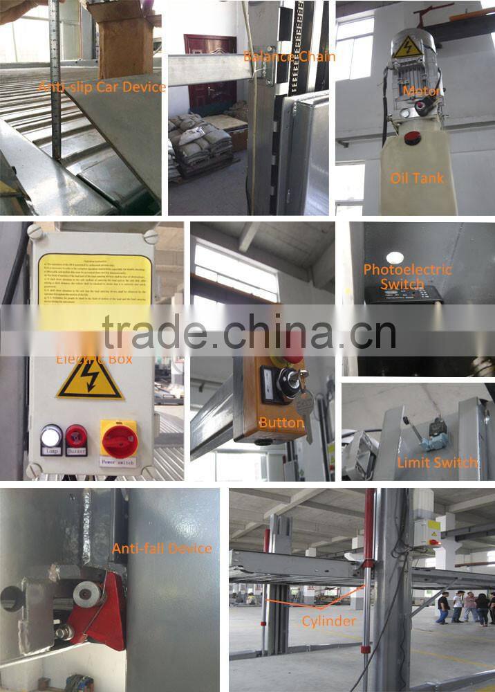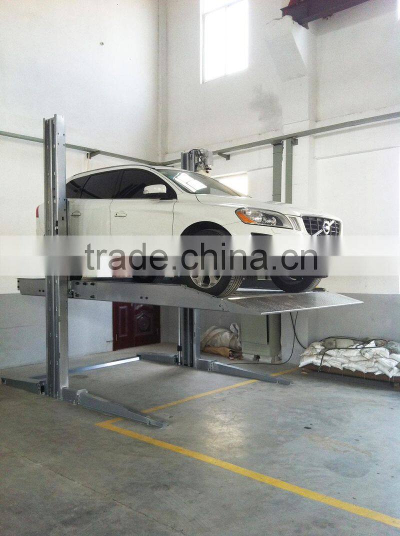 1. 2 post smart auto parking system/Hydraulic double level parking equipment/Two post car parking lift is designed of two spaces of up and down as one unit. The bottom car can go in and out directly. When the upper space needs to park a car, the car in the bottom should be driven out.