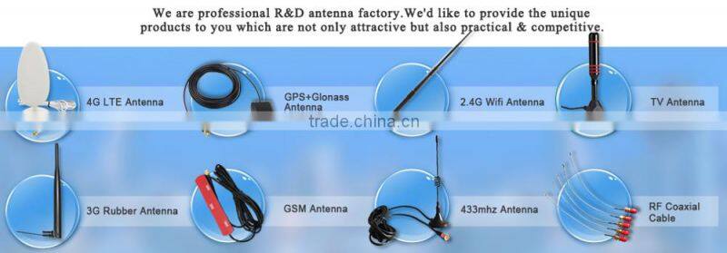 Our main products including GSM/CDMA//3G/4G antenna,2.4GHz(WIFI,WLAN)/3.5GHz(WIMAX)/5.8GHz/Spread spectrum communication antenna series(including omni antenna,grid antenna,YAGI antenna,indoor covering antenna,Ceiling mounted antenna,wall hanging antenna, panel antenna,dual polarization antenna,broadband antenna,rubber antenna,vehicle-mounted antenna,magnetic base antenna,etc.)DVB-T/DMB-T/CMMB Moving digital TV antenna,low-frequency antenna 315MHz /433MHz Wireless digital wireless monitoring/wireless antenna, GPS antenna, communications accessories: cable (feeder), connectors.