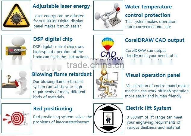 | Applicable Material | Acrylic, Crytal, Glass, Leather, MDF, Paper, plastic, Plexiglax, Plywood, Rubber, Stone, Wood | Graphic Format Supported | AI, BMP, DST, DWG, DXF, DXP, LAS, PLT | |
