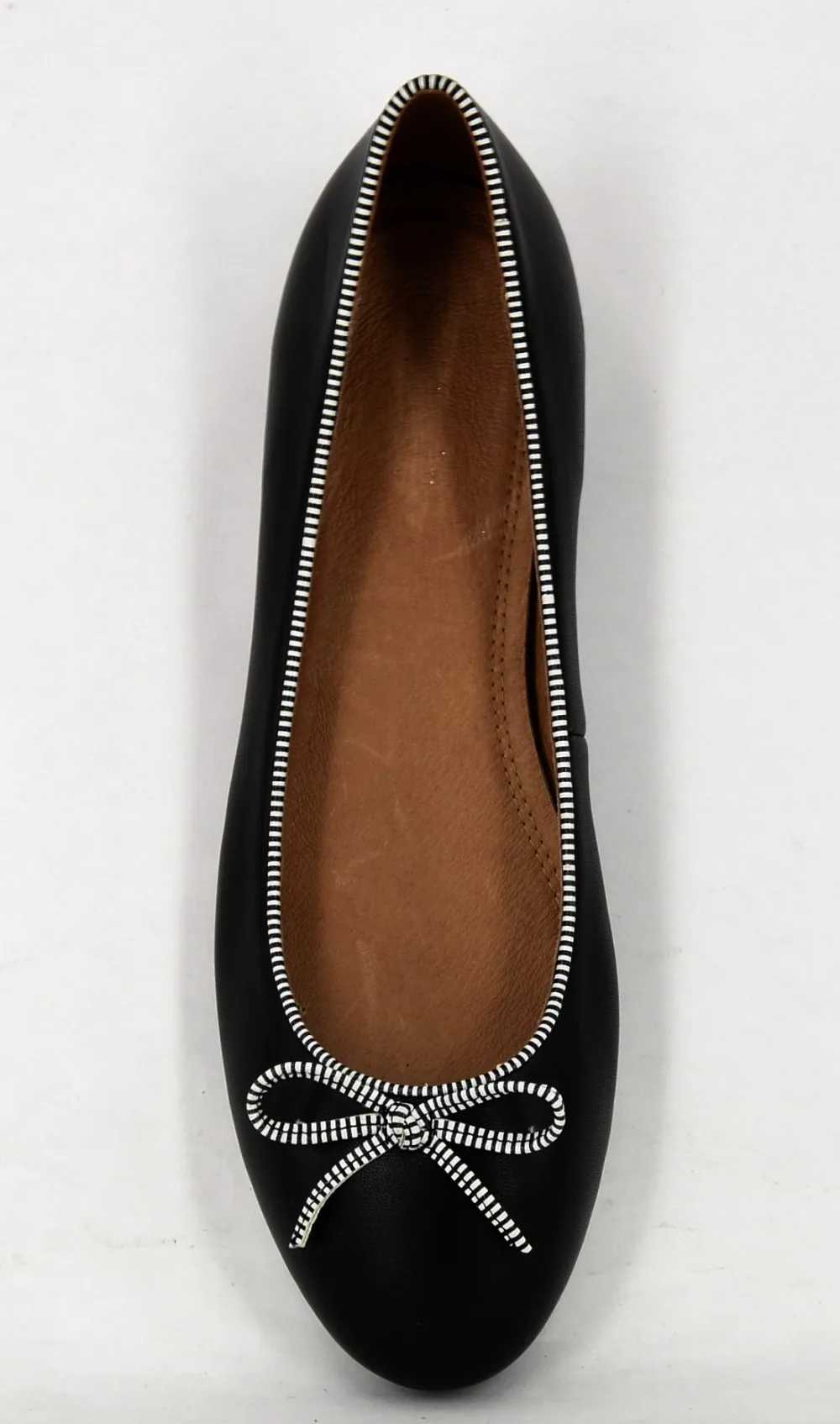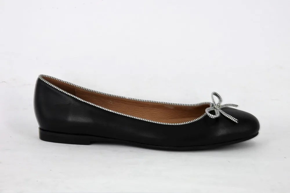 A classic pump with a black soft leather upper featuring a zebra top piping and delicate bow detail.