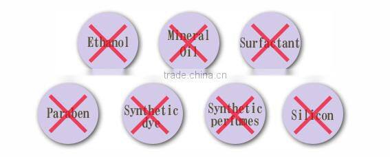 Surfactant, Ethanol, Mineral oil, Silicon, Paraben, Synthetic dye and Synthetic perfumes.