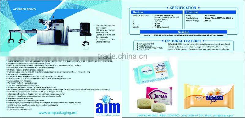 This is our most successful model for packing toilet soaps, laundry soaps, detergent soaps in plastic pouches. The maximum achievable speed of machine is 350 pieces per minute (depending upon the dimensions of soap).