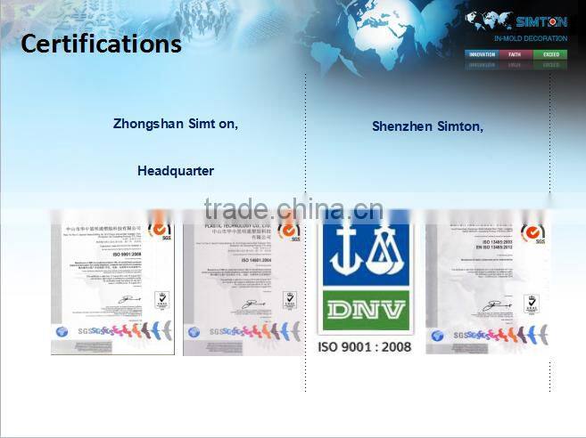 For over 10 years,Simon group has been dedicated to providing customized &globally competitive IMD(In-mold decoration )as well as HMI (Human Machine Interface) solutions for OEM/ODM in a wide range of industries,such as Consumer Electronics,Wearable Electronics Appliances,Medical Electronics,Automobile Electronics,Instrumentation,Accessories,Telecommunication,Audio,and so on.As the leader of in mold decoration industry,to day Simon group has established five independent organizations,including the headquarter,a US office in Boston and three IMD manufacturing bases respectively located in Sheena,Tangshan and Hangzhou cities,offers an overall daily output of 100K~200K cps of IMD/IML related products.