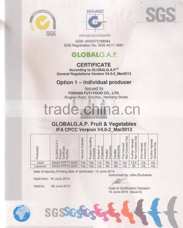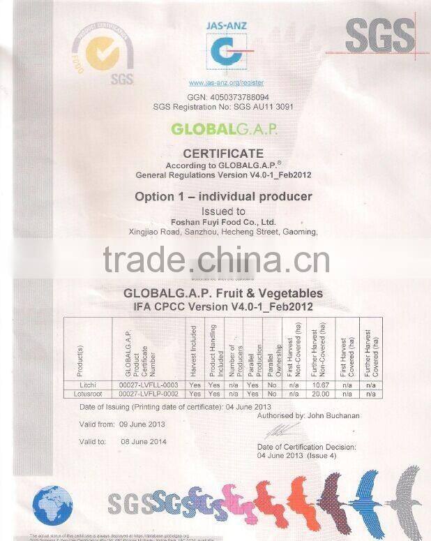 Vegetables like: lotus root, arrow root, bulb onion, apios americana, red bud taro,lily, ginkgo, water chestnut, arrow head, ginger,caltrop, edible fungi and garlic etc., and fruits like: lychee, longan, fragrant pear, ya pear,apple and chestnut. We hold a big market share of lychee and longan in America.fresh sweet potato