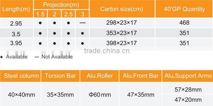 | Awning Size | Max size: 3.95*3m and available projection: 1.5/2/2.5/3m |