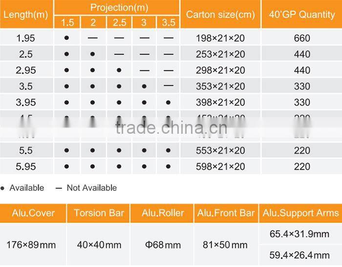 | Awning Size | Max size:5.95x3.5m and available projection:1.5/2/2.5/3/3.5m |
