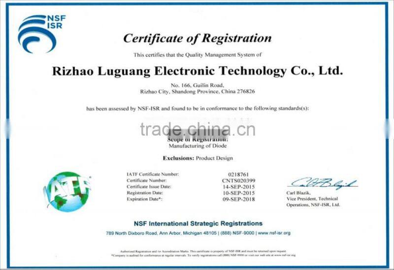 Manufacturing Electronic Components since 2002 Luguang Electronic Technology started out as a manufacturer of electronic components in 2002 in mainland China. Today, we have grown to become one of the largest makers of axial plastic diodes, glass passivated diodes, surface mount diodes, bridge rectifiers, transistors for digital products, lighting products, as well as other consumer electronics. Our two ISO 9001:2000-certified factories have a total of 10 production lines and are operated by 1,300 workers capable of producing millions of units per month. Producing 20 New Models Monthly Our 40-man R&D team, with an average experience of seven years, produces 20 new models monthly. We also maintain a fruitful technical knowledge exchange with engineers from Shandong University. This provides us with the expertise to complete your specifications accurately. Delivery Done in One Week Our continuous partnership with 100 raw material suppliers ensures the quality of our products and speedy one-week delivery. By having our own molding facility, we make sure your orders are defect-free. Join Philips and Motorola in sourcing our products. Contact us today.